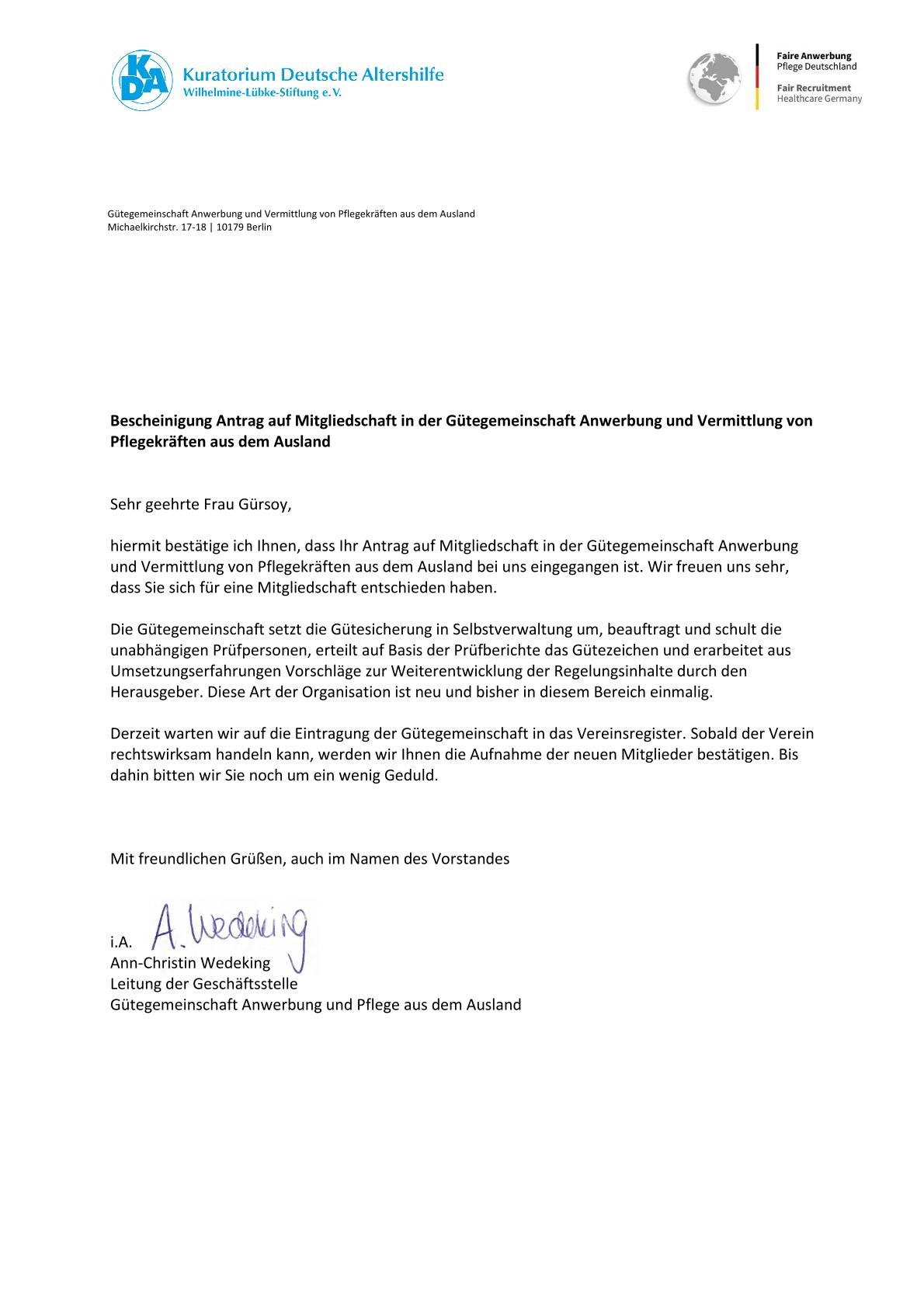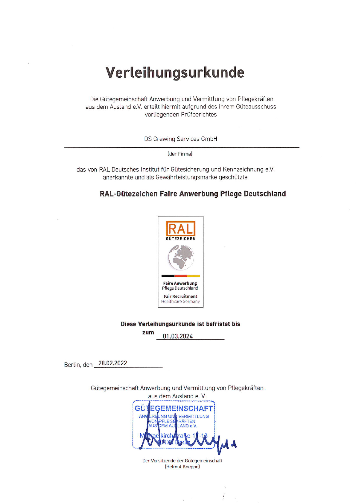 Im Februar 2022 hat die Gütegemeinschaft Anwerbung und Vermittlung von Pflegekräften aus dem Ausland e.V. die ersten RAL-Gütezeichen „Faire Anwerbung Pflege Deutschland“ vergeben.