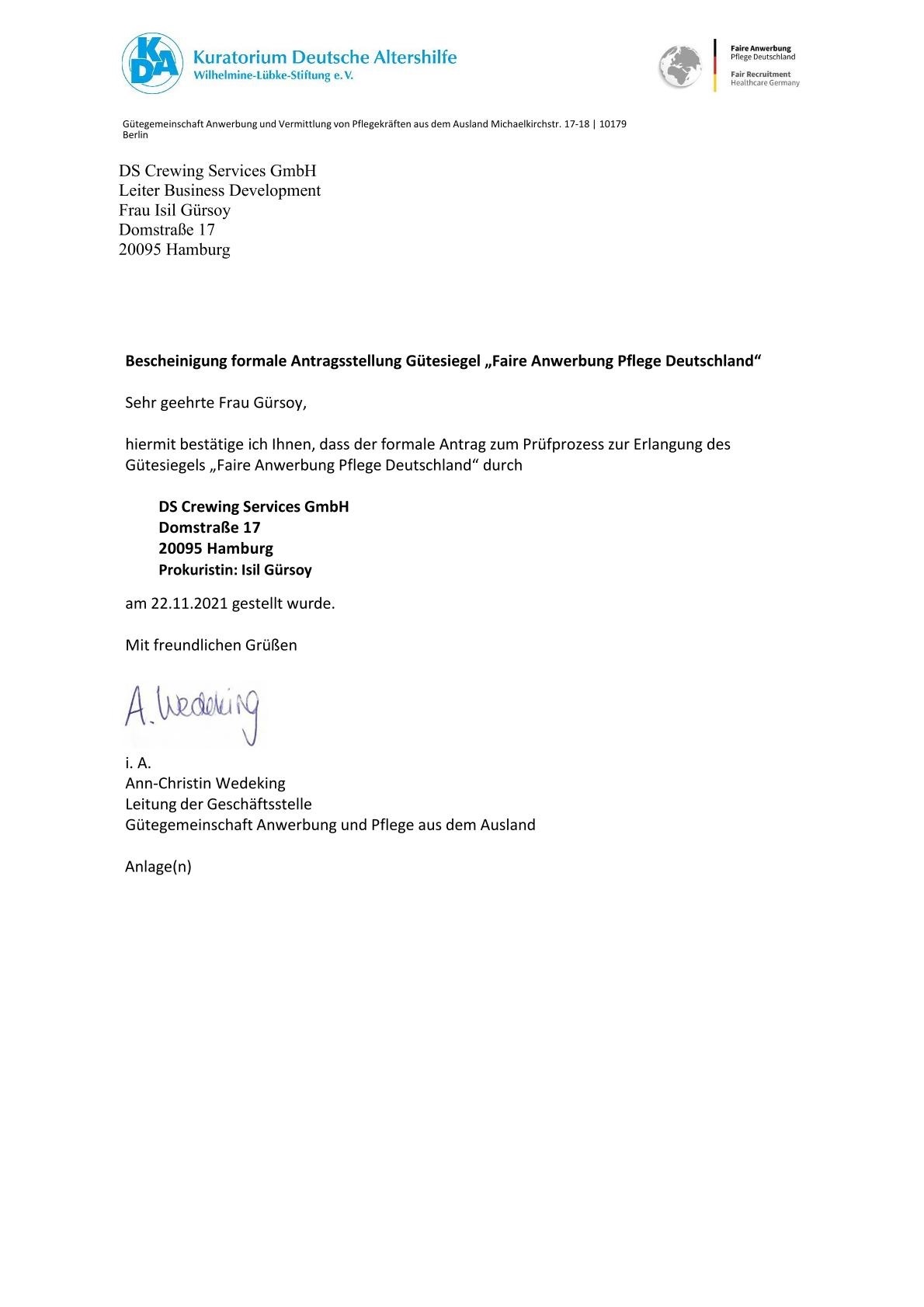 DS Crewing Service GmbH gehört nun auch zu den Unternehmen, die ausgezeichnet und zertifiziert wurden für ihre ethisch vertretbaren, fairen und transparenten Vermittlungsprozesse. Die Anwerbung internationaler Pflegekräfte ist eine von mehreren unserer Personalmarketing-Maßnahmen, mit denen dem Fachkräfte- und Personalmangel in der Pflege in Deutschland entgegengewirkt werden kann. Im Auftrag des Bundesgesundheitsministeriums (BGM) wurde das Gütesiegel „Faire Anwerbung Pflege Deutschland“ entwickelt. Es zeichnet Vermittlungsagenturen aus, die den Prozess der Anwerbung ethisch, fair und transparent gestalten.