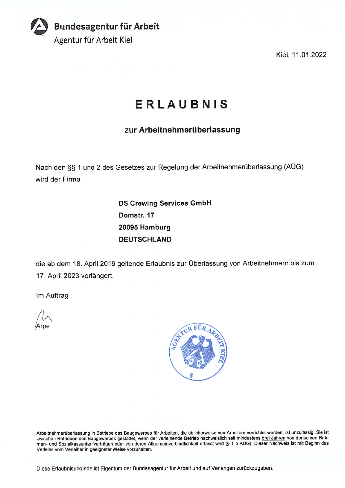 Die DS Crewing Services GmbH besitzt auch die Erlaubnis zur Arbeitnehmerüberlassung und erfüllt somit alle Regeln und Rahmenbedingungen der Arbeitnehmerüberlassung.